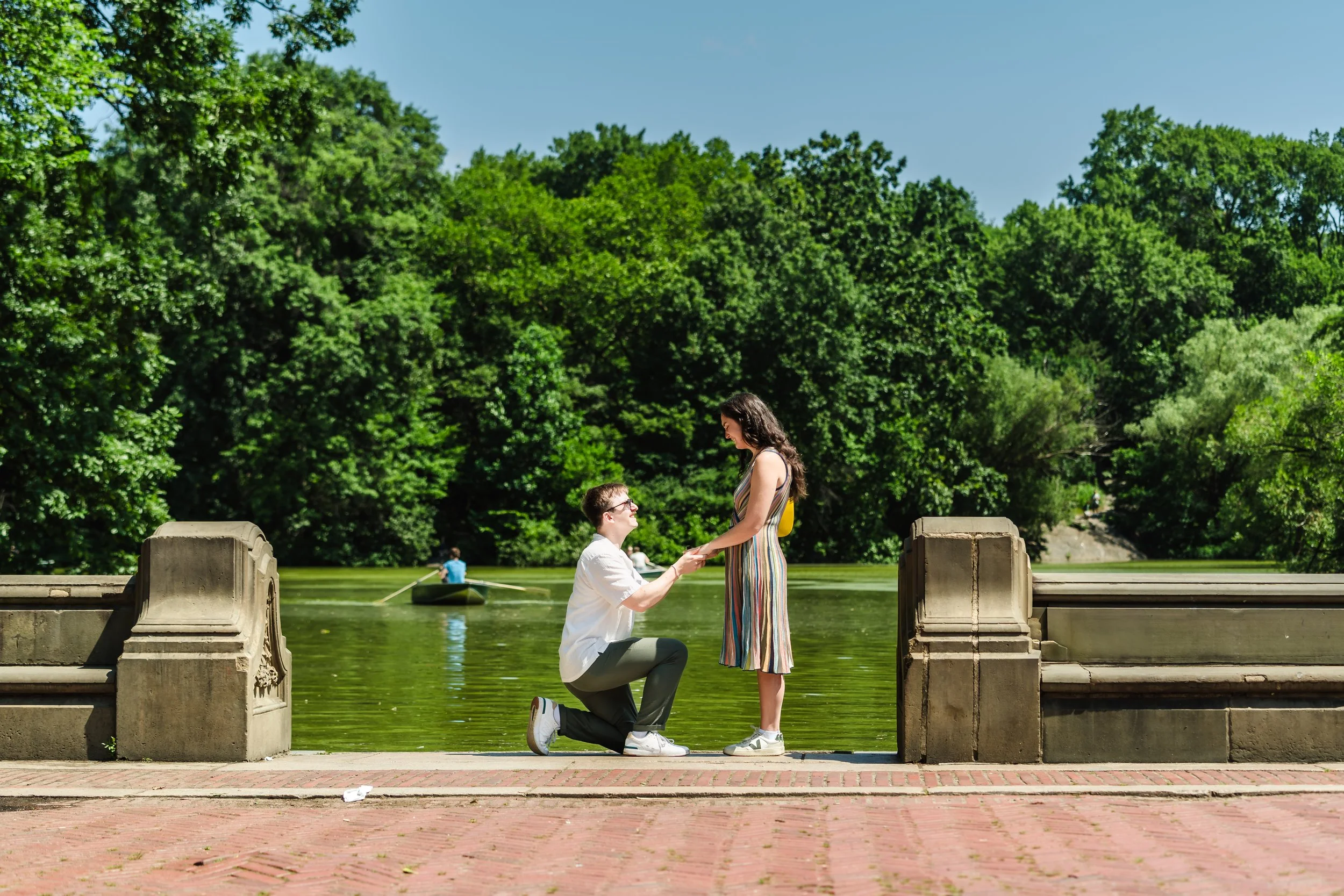 In June of 2025, they traveled back to New York for one of Bart’s friends’ weddings. They walked through Central Park and stopped by a beautiful pond, where Bart got down on one knee and proposed. It turned out he had secretly paid his friend to follow them and take candid photos and because Ellie had no idea, the photos turned out amazing.